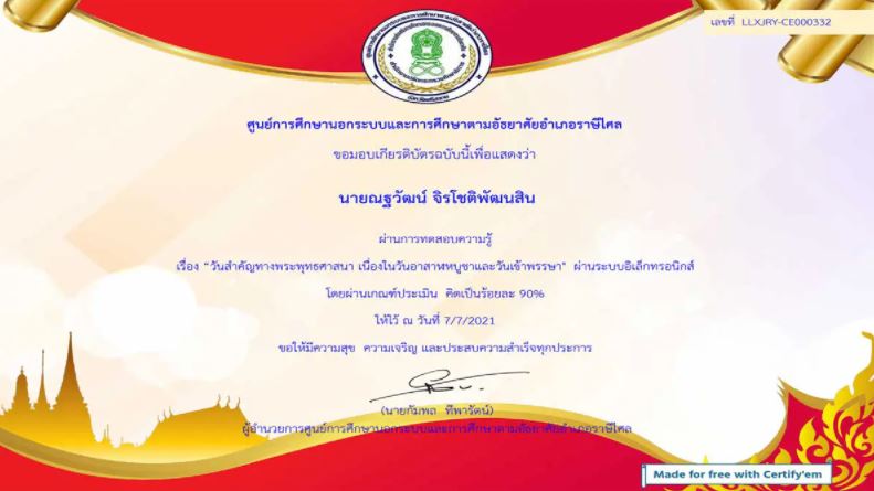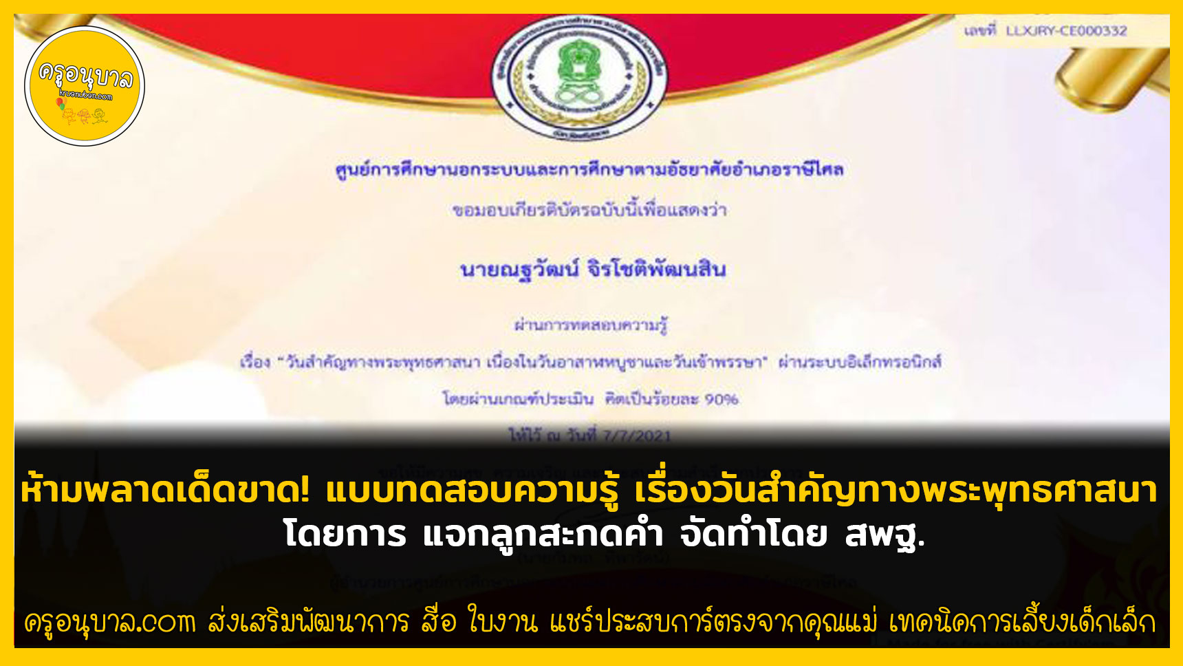 วันนี้ ครูอนุบาล.คอม ข่าวการศึกษา อยากเชิญชวนคุณครูและผู้ที่สนใจทุกท่าน เข้าร่วมการทำแบบทดสอบความรู้ เรื่องวันสำคัญทางพระพุทธศาสนา เนื่องในวันอาสาฬหบูชาและวันเข้าพรรษา หากทำได้คะแนนร้อยละ 70 ขึ้นไป รับเกียรติบัตรออนไลน์ โดยห้องสมุดประชาชน “เฉลิมราชกุมารี” อำเภอราษีไศล จังหวัดศรีสะเกษ
